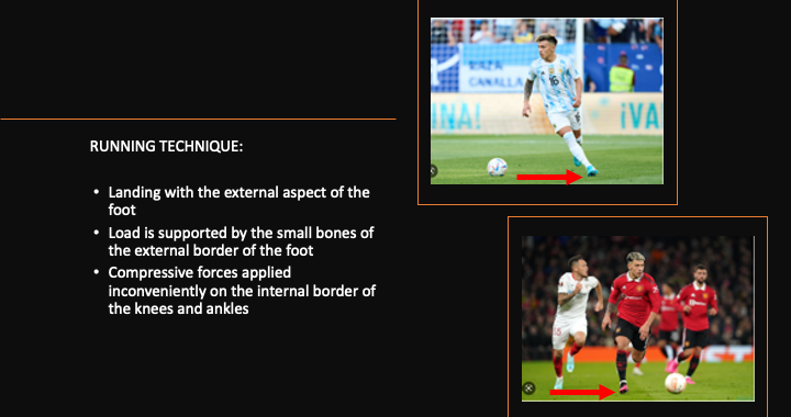 Considering that a professional player runs at least 60 kilometers a week for many years, performs many thousands of kicks, and many other similar techniques (jumping, landing, lifting, etc.) the inadequate technical load on the external aspect of the foot might be the main cause of his current injury on the right foot.